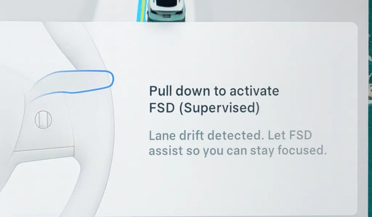 Mostantól, ha az autó azt érzékeli, hogy a sofőr fáradt, vagy többször aktiválódik a sávtartási figyelmeztetés, a kijelzőn felugró üzenet jelenik meg, amely az FSD bekapcsolását ajánlja: