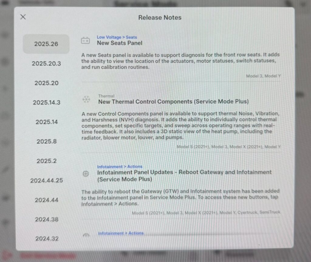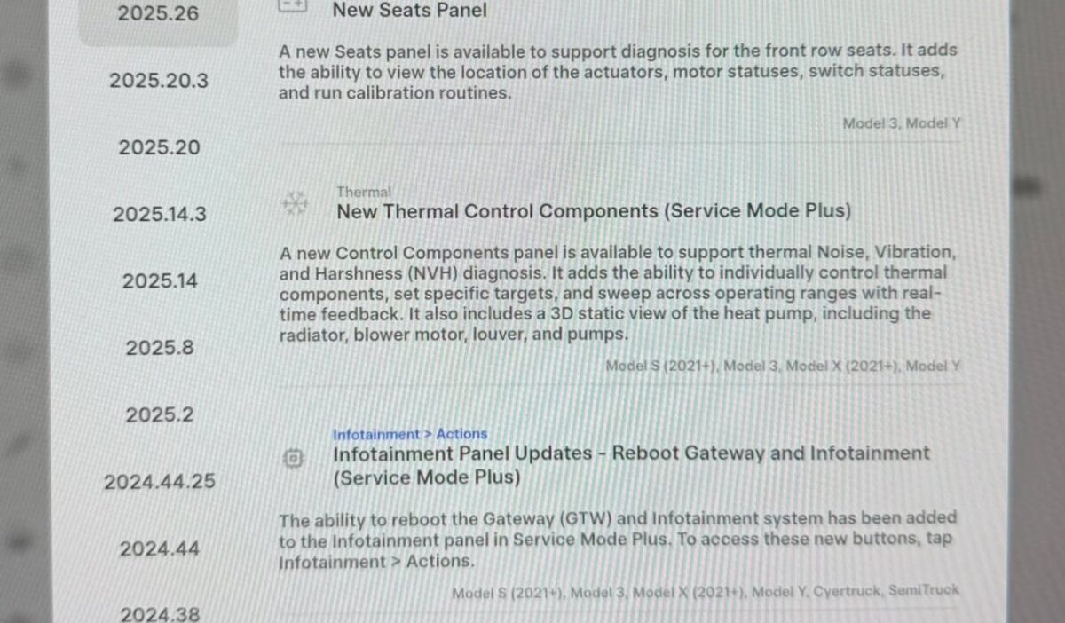 A frissítés több új lehetőséget is hozott a Szervizmódban. A Model Y új járműfunkciók panelt kapott, amely áttekintést nyújt az összes funkció állapotáról. A Model 3 és Model Y esetében elérhetővé vált egy új üléspanel, amely részletes diagnosztikai információkat nyújt. A Model S, Model X, Model 3 és Model Y modellekben megjelent a hőszabályozási panel, amely lehetővé teszi a hőszivattyú elemeinek pontosabb vizsgálatát. Emellett több változtatás történt az infotainment, a hűtőközeg és az energiaelosztási panelekben is, különösen a Cybertruck esetében.