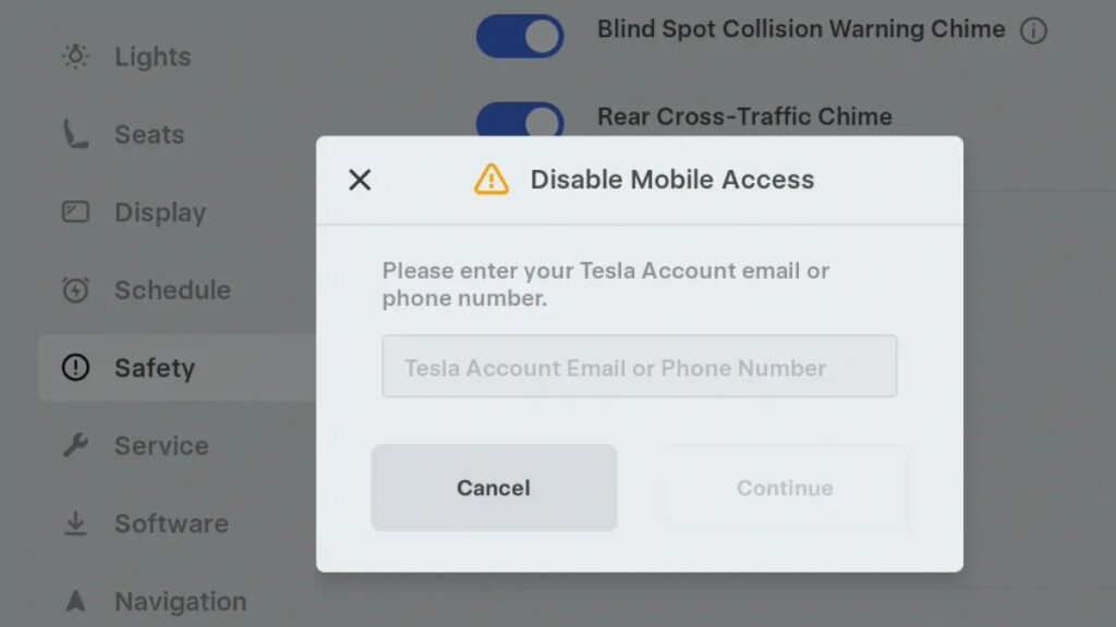 Kezelőelemek menü Biztonság pontjában elérhető Mobilhozzáférés funkció letilthatja a Tesla mobilalkalmazásból történő vezérlést. Ez megakadályozza, hogy bárki távolról kinyissa a járművet vagy nyomon kövesse annak helyzetét. A frissítéssel már nemcsak az e-mail címmel, hanem a fiókhoz tartozó telefonszámmal is hitelesíthető a kikapcsolás, így biztonságosabbá vált a rendszer.
